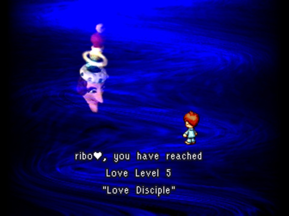 18 years before Undertale, moon: remix RPG adventure‘s greatest strength was that it was equal parts totally unique and effortless to understand. Developed by LOVE•de•LIC inc. and written by Yoshiro Kimura, moon is a game about a world that has been devastated by a great Hero, who in his travels kills monsters and animals for experience and raids everybody’s houses for loot. While the Hero levels up and becomes stronger through violence, you play as a young boy who, sucked into the game world isekai style, levels up and gains experience through gathering love. Love is the most important and precious thing in the world, and you can find it everywhere just by walking around. You find love by doing all sorts of things: witnessing something interesting, helping a friend, or bringing back the lives of the animals slain by the Hero. Teaching your gramby’s dog a trick, smelling the pollen, lighting a fire in someone’s heart… That is Love. This is Love. moon, a game that markets itself as an “anti-RPG,” is all about collecting love from the people you meet and the places you go.