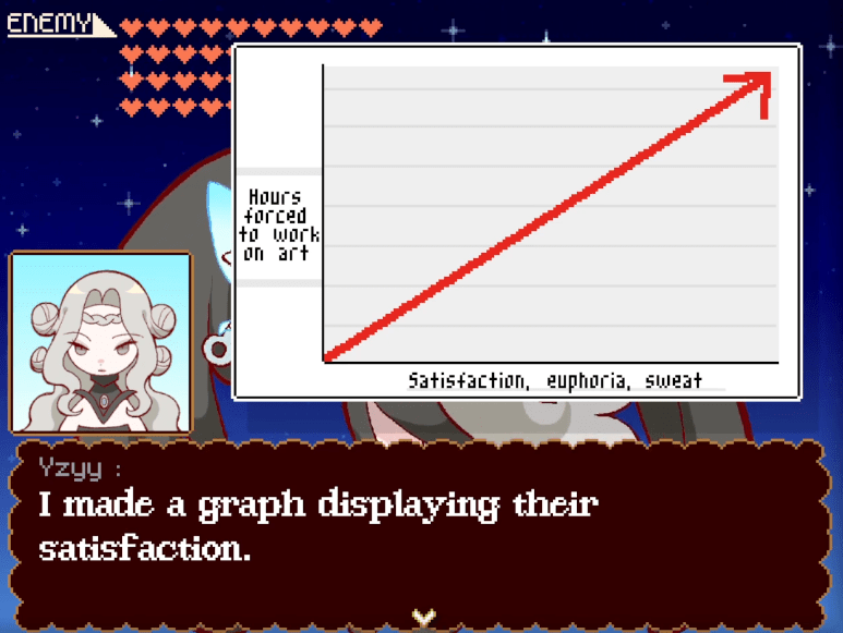 If this game has a theme, ultimately this is it. Everybody in Catgirl has some kind of artistic practice they love to make or consume in one way or another, and each of their relationships with this art is twisted when they’re forced to make slop they don’t care about under conditions they aren’t happy in. This applies to all of the major characters: with Star, who has to draw images of her captor when all she really wants to draw is cats, or with Nova, who has to change the names of all the characters in the library to the names of the antagionist, or with Jieun, who has to rewrite all her songs to be about evil women controlling her. They, too, have The Worm, this perceived responsibility to create, pushed unto them by forces outside of their control. For me it’s a real, actual Worm which tangibly exists. You can pick it up and stretch it out and everything. The Worm for them just happens to take the form of a beautiful woman or demon lady, who imprisons them and forces them to do what she desires. That part doesn’t sound so bad to me!!!! But different strokes etc. My point is that they have to spend their time productively, and only in doing so are they allowed to feel “satisfied” by their work. But left to their own devices, all these pretty girls love making art not because it’s a productive thing to do to advance their career and impress their boss or whatever, but because it’s fun.